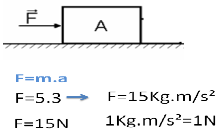 (UEL-1996) O bloco A têm massa mA= 5,0kg e está apoiado num plano horizontal perfeitamente liso. Aplica-se ao corpo A uma força horizontal F , que faz o bloco se movimentar com uma aceleração a= 3m/s².. Calcule a força F